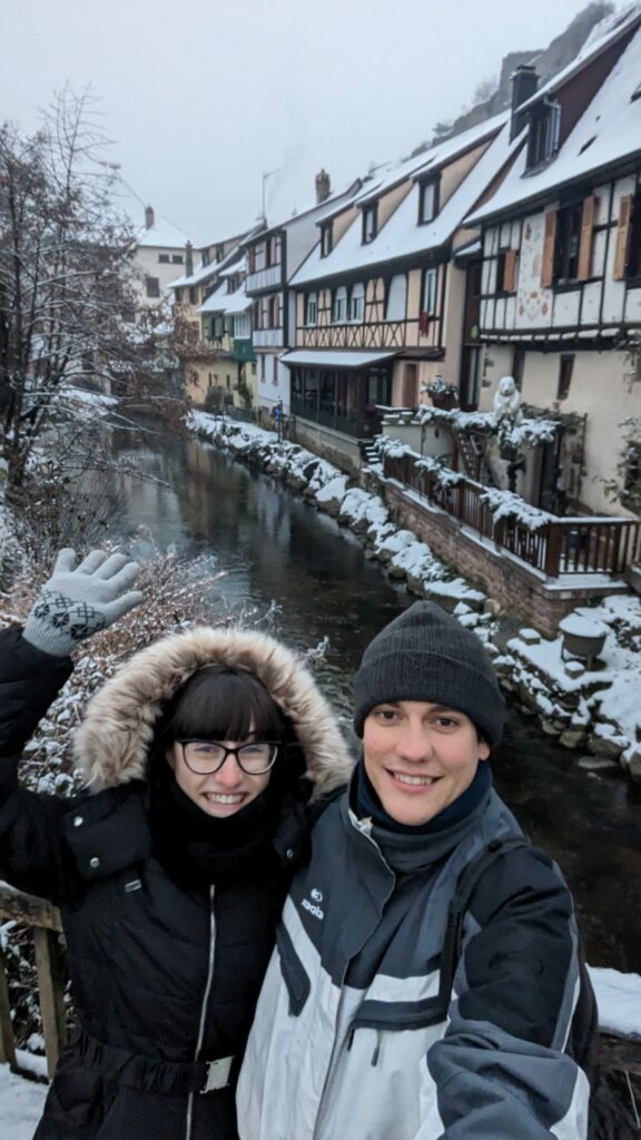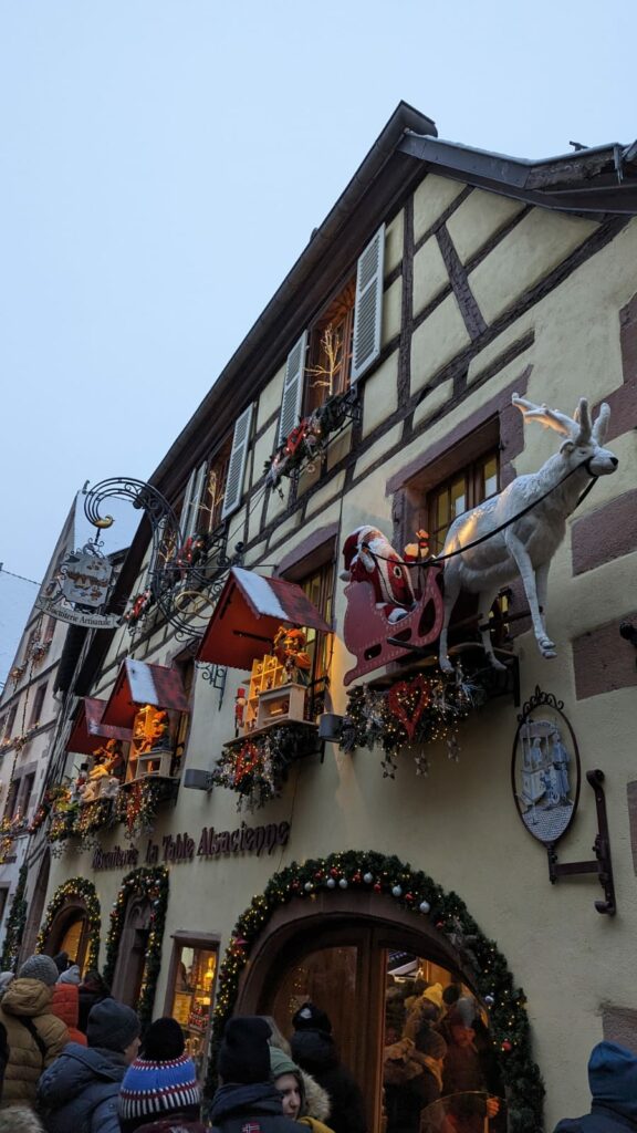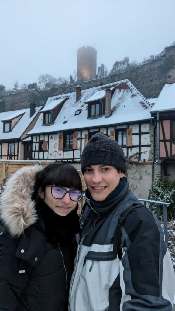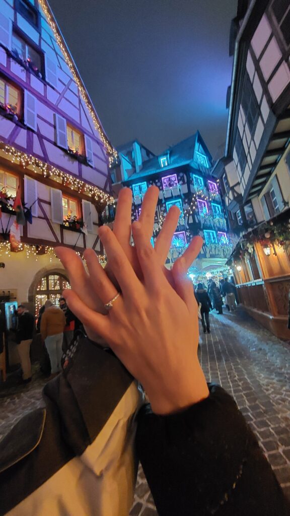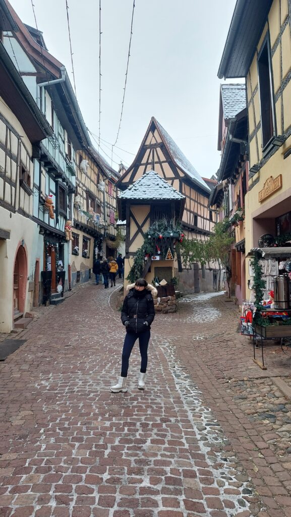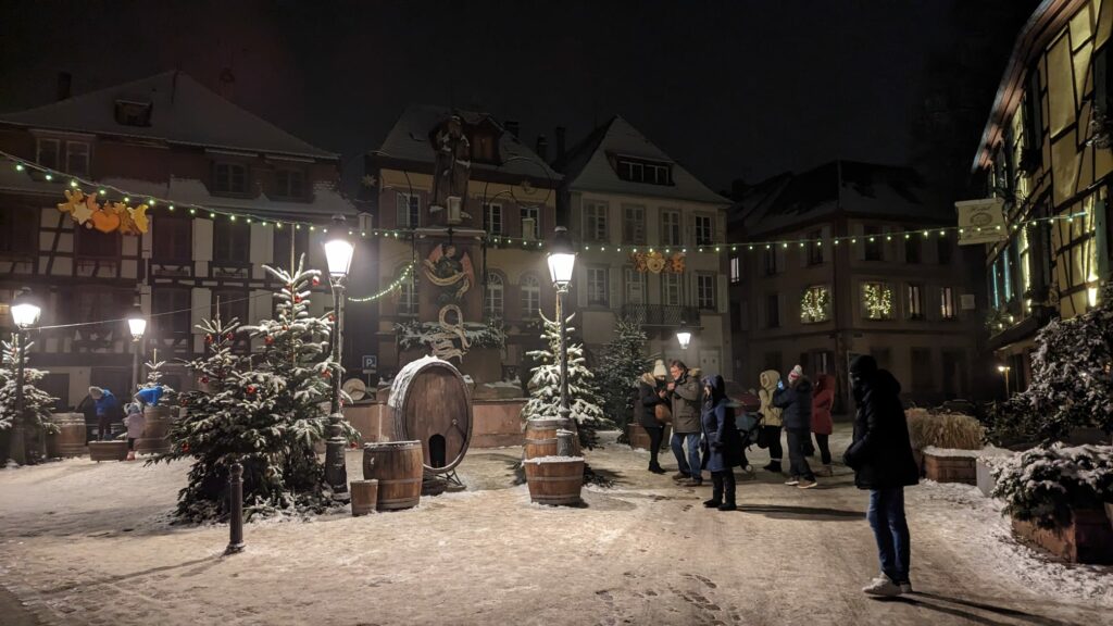 Paseamos por las calles en forma de anillo de Eguisheim, que parecen de cuento. En ellas hay mucha decoración navideña, y encontramos puestos donde venden vino caliente (vin chaud), así que aprovechamos para degustarlo. Es un sabor raro al que no estamos acostumbrados, pero nos ayuda a mantenernos calientes con el frío que está haciendo.