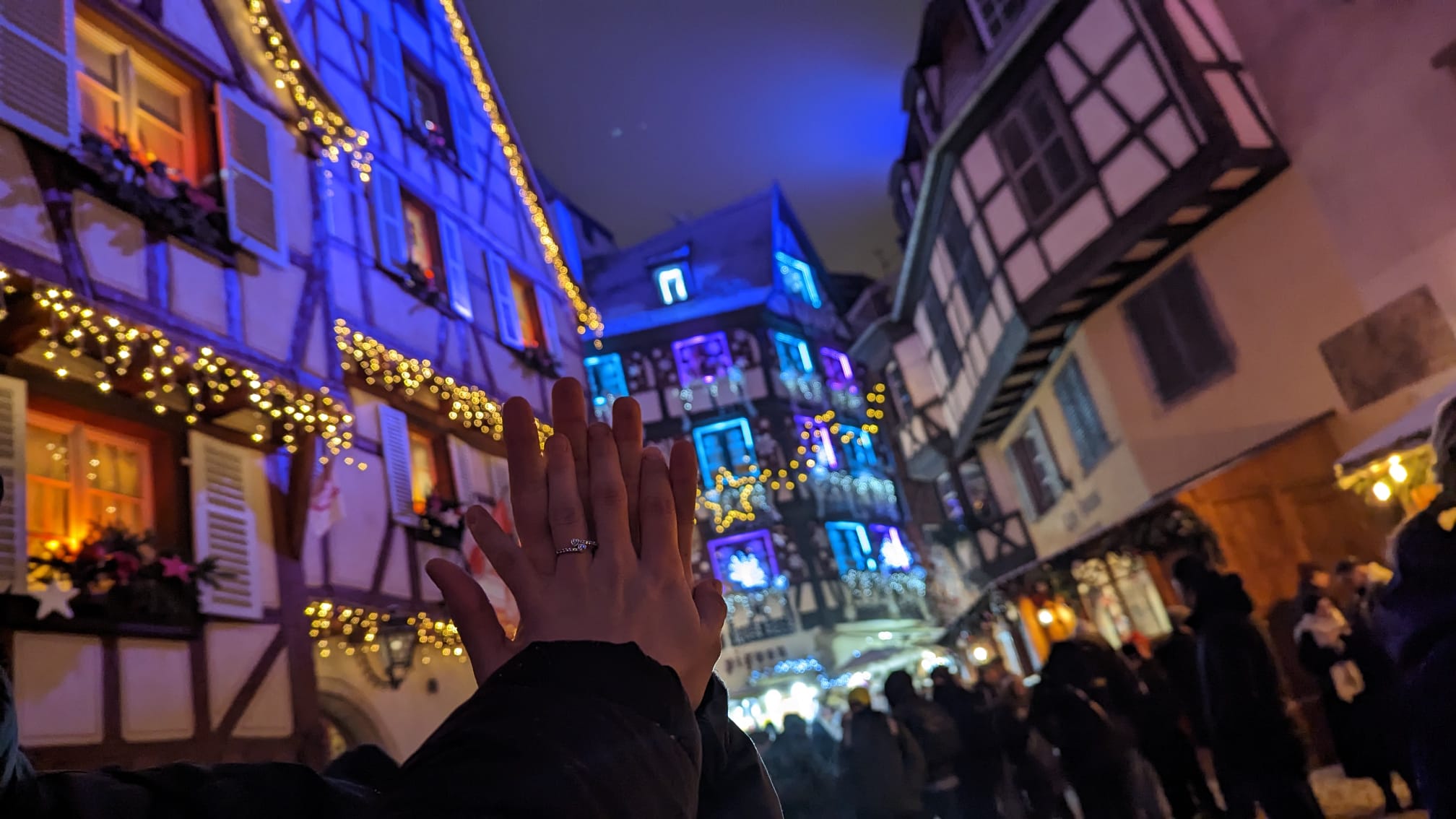 Nosotros llegamos cuando ya es de noche, y la verdad es que ya no hay mucho ambiente por las calles. Sí que es verdad que hay mucha decoración y luces de navidad, pero nada que ver con Colmar.
