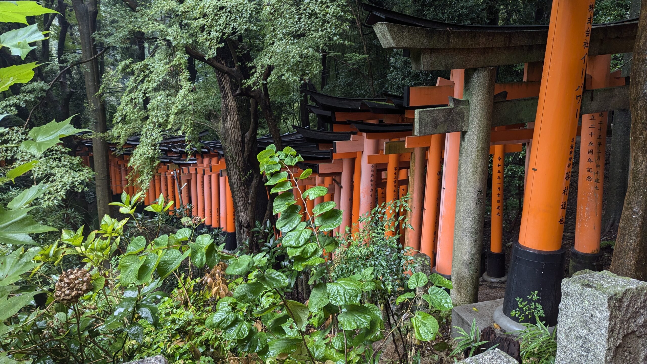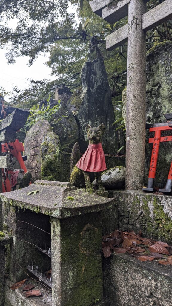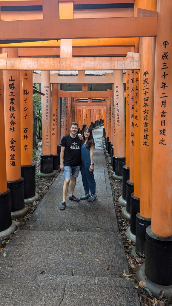 Solamente salir de la estación, ya estamos en Fushimi-Inari. Se trata de uno de los santuarios sintoístas más importantes de Japón (y uno de los lugares más turísticos de Kyoto). Destaca por los miles de toris rojos que forman caminos serpentinos hasta llegar a la cima del Monte Inari. Se fundó en el siglo VIII y los visitantes pueden recorrer sus senderos disfrutando de la naturaleza y descubriendo diferentes santuarios y estatuas de Inari (estatuas con forma de zorro).