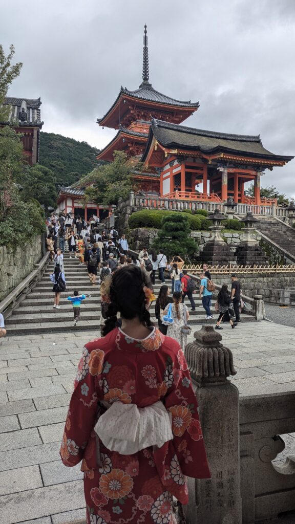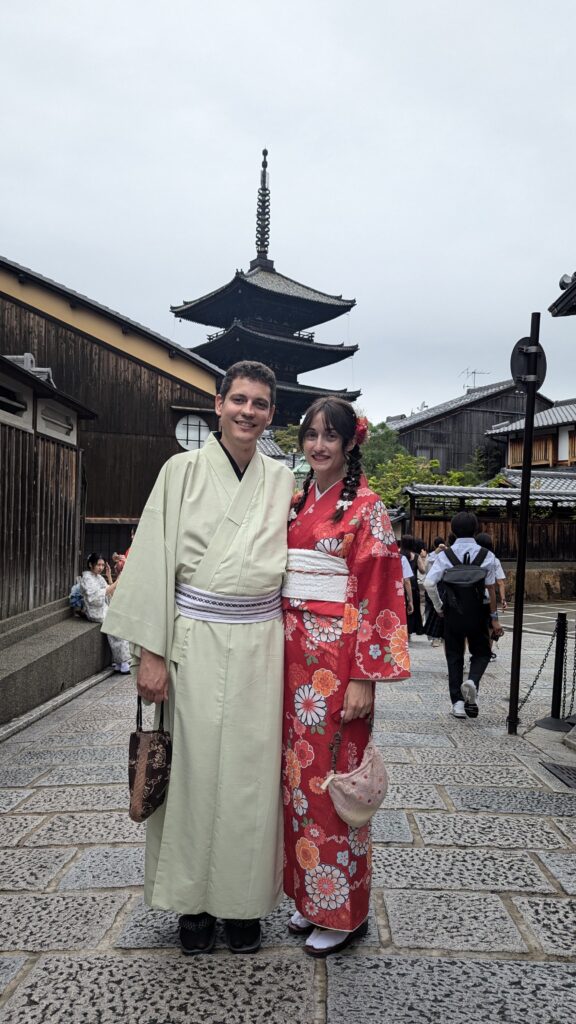 Así vestidos, nos vamos caminando por las calles de Ninenzaka y Sannenzaka. Estas famosas calles, conectan con el templo Kiyomizudera. Se caracterizan por sus pendientes estrechas y empedradas, rodeadas de casas de madera tradicionales de Kyoto, con tiendas de artesanía y restaurantes que conservan el encanto del Japón antiguo. Desde ellos, podemos ver la famosa Pagoda Yasaka. Hemos de decir, que cuesta muchísimo caminar por estas cuestas con las sandalias y con el kimono.