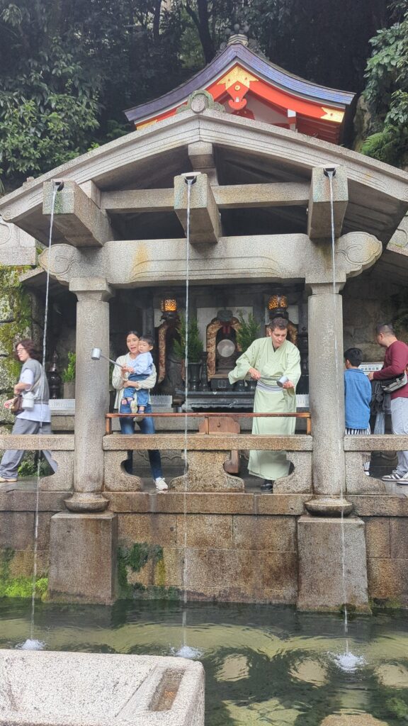 El agua de la cascada de Otowa se divide en tres canales. Los visitantes la pueden recoger con unos cazos con un mango largo para beber de ella. Según la tradición, cada corriente significa un deseo (salud, longevidad y éxito académico, en ese orden). Si bebes de un solo canal, se asocia con que eres un afortunado, pero si bebes de todo, se te considerará poco respetuoso o avaricioso. Hay una pequeña cola para hacer este ritual, pero nosotros lo hacemos.
