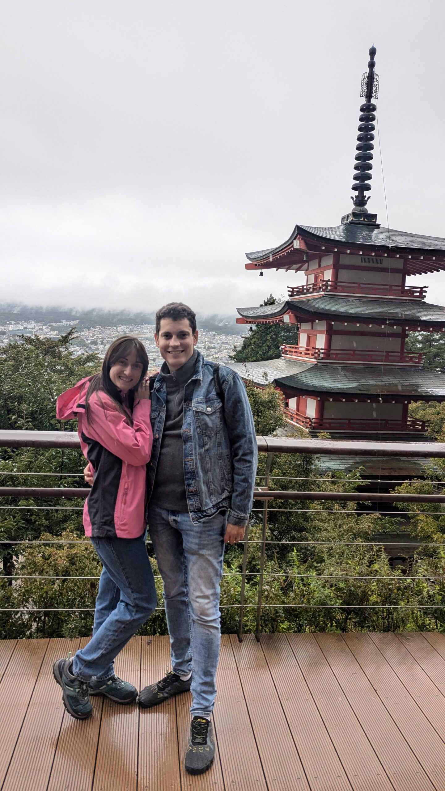 Llegamos a la Pagoda Chureito, pero tal y como íbamos viendo durante toda la subida, el Monte Fuji está completamente tapado hoy, así que nos tendremos que conformar con una foto en la que solo aparezca la pagoda. Por suerte, ya no llueve, pero en el parque todo está muy mojado.