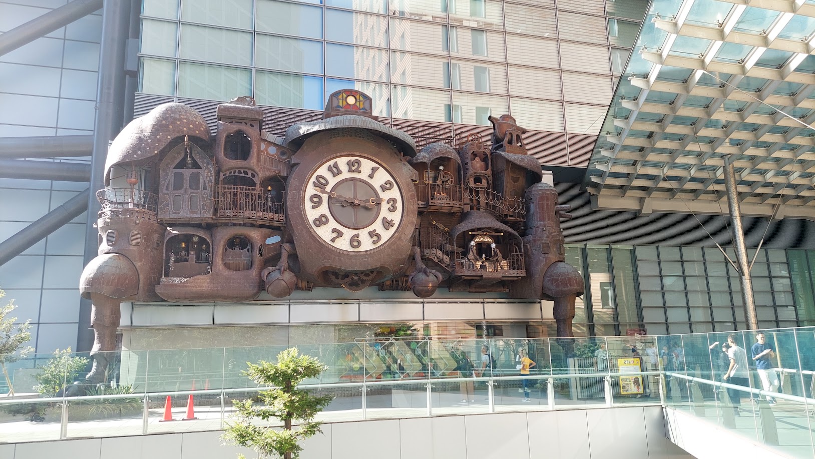 Lo que realmente nos interesa de aquí, es que en el pie de la torre de Nippon TV encontramos el reloj diseñado por Hayao Miyazaki (Studio Ghibli), que en algunas horas en punto, hace una pequeña actuación durante unos minutos con música y personajes animados. En nuestro caso, esperamos hasta las 15:00. La verdad es que había varias personas agrupándose a las horas clave para ver el espectáculo.
