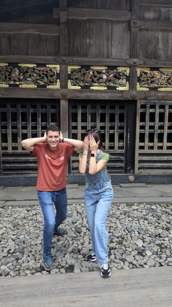 Subiendo las escaleras encontramos la majestuosa y dorada puerta de Yōmeimon, decorada con más de 500 tallas de madera incluyendo animales míticos, criaturas chinas y escenas de la vida cotidiana. También se la conoce como «puerta que nunca te cansas de mirar». Y seguidamente también encontramos la puerta de Karamon, desde la que se puede acceder a los salones del santuario. Para visitar estos salones, nos tenemos que quitar los zapatos.