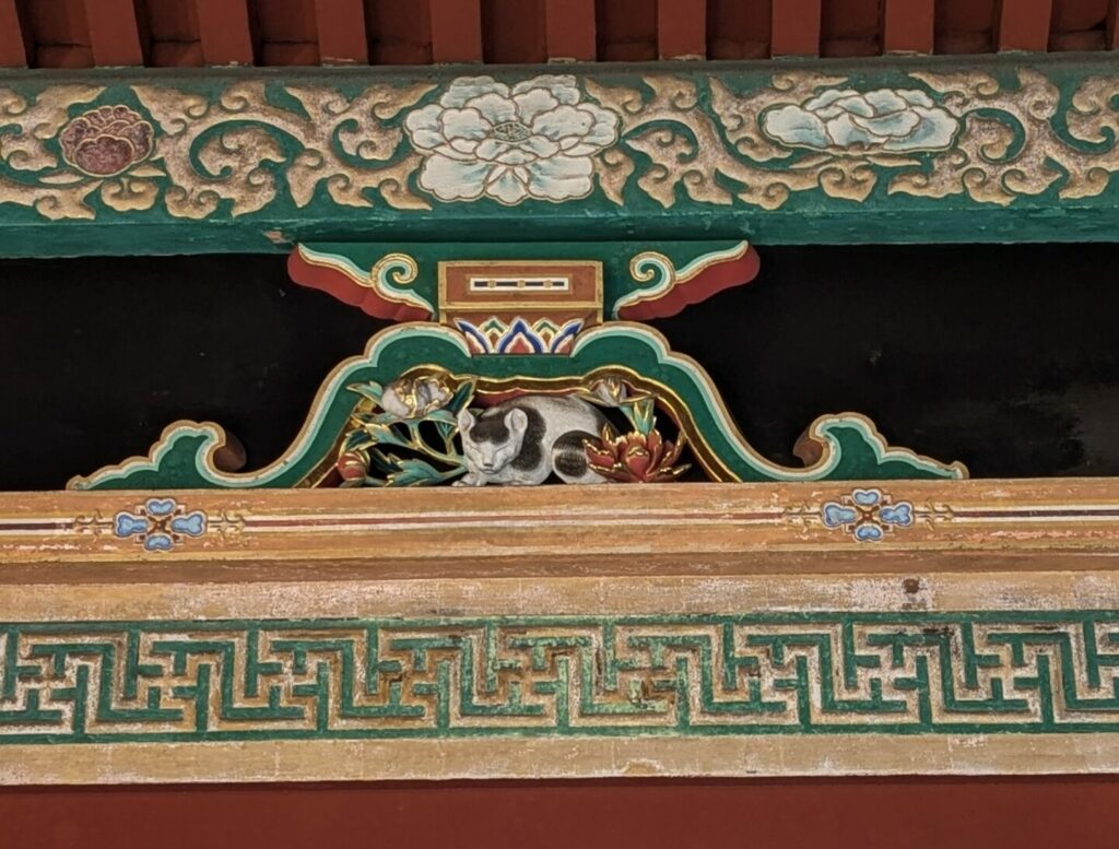 Antes de salir por la puerta lateral (puerta Sakashitamon), vemos la famosa talla de Nemuri-neko, que representa un gato durmiendo y simboliza la paz y la armonía. La veremos fácilmente, ya que justo en la puerta hay un cartel que pone «Sleeping cat, look up».