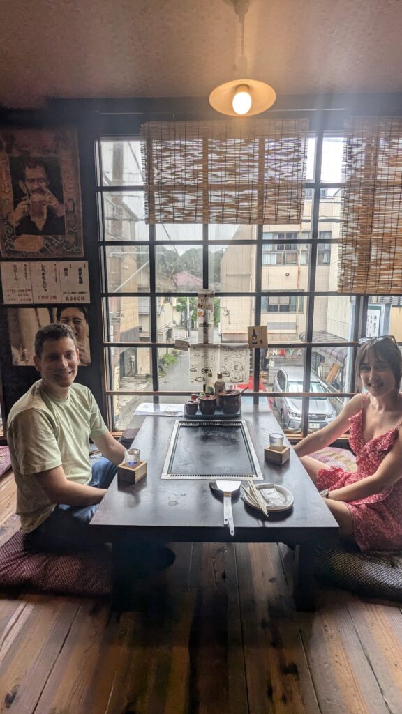 Restaurante tradicional japonés en el que nos sentamos en una mesa típica, en el suelo, sobre un cojín. La mesa tiene una plancha para que nos hagamos la comida nosotros mismos.