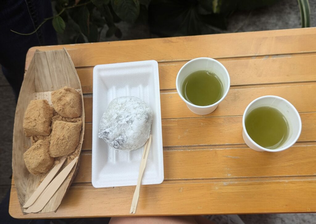 Warabimochis, Mame Daifuku y dos vasitos de matcha en Takeya