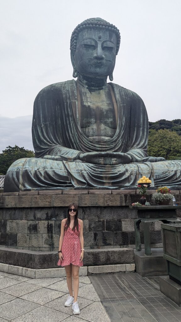 La estatua de bronze, conocida como Daibutsu, mide 11 metros de altura y fue construida en el siglo XIII. Inicialmente estaba dentro de un pabellón que fue destruido por tormentas y tsunamis dejando la figura al aire libre, tal y como la podemos observar hoy.