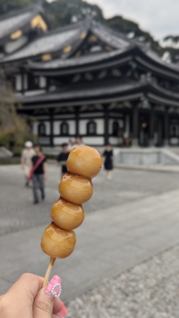 Dentro del templo vemos un puestecito donde venden dangos, el típico dulce japonés que vemos en los animes, hecho de varias bolitas de arroz con azúcar en un pincho. Personalmente, este dulce no nos encantó, ya que tenía un sabor muy fuerte a arroz y salsa de soja, y se nos hizo un sabor algo raro, muy dulce y salado a la vez.