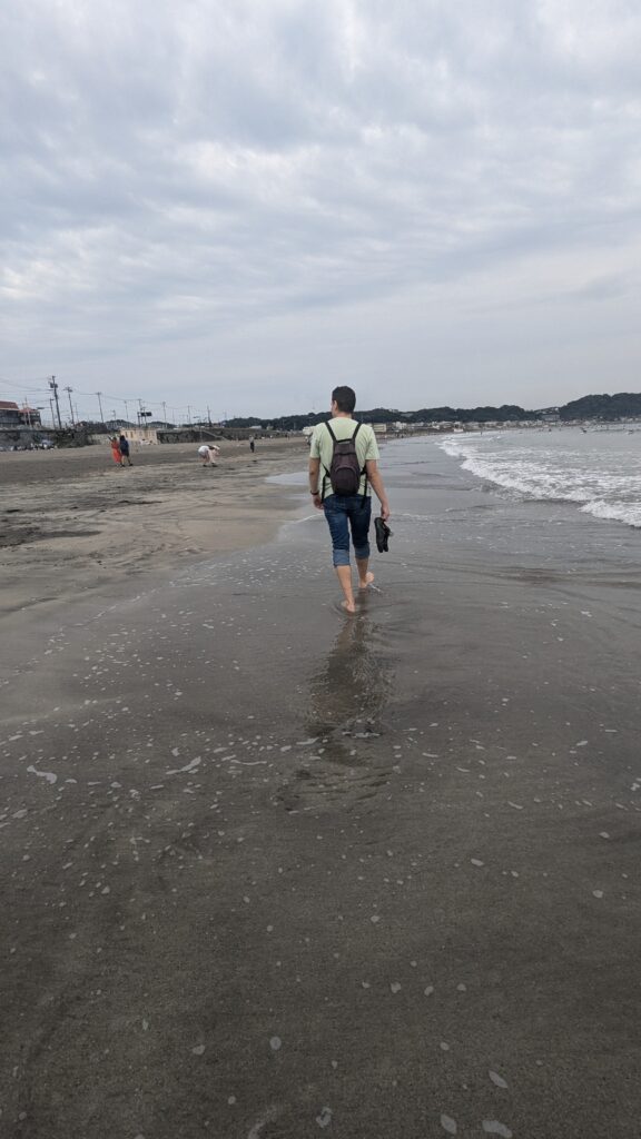 Así, saliendo del templo y bajando de la colina, nos vamos a la playa de Kamakura y nos quitamos los zapatos para caminar por la orilla.