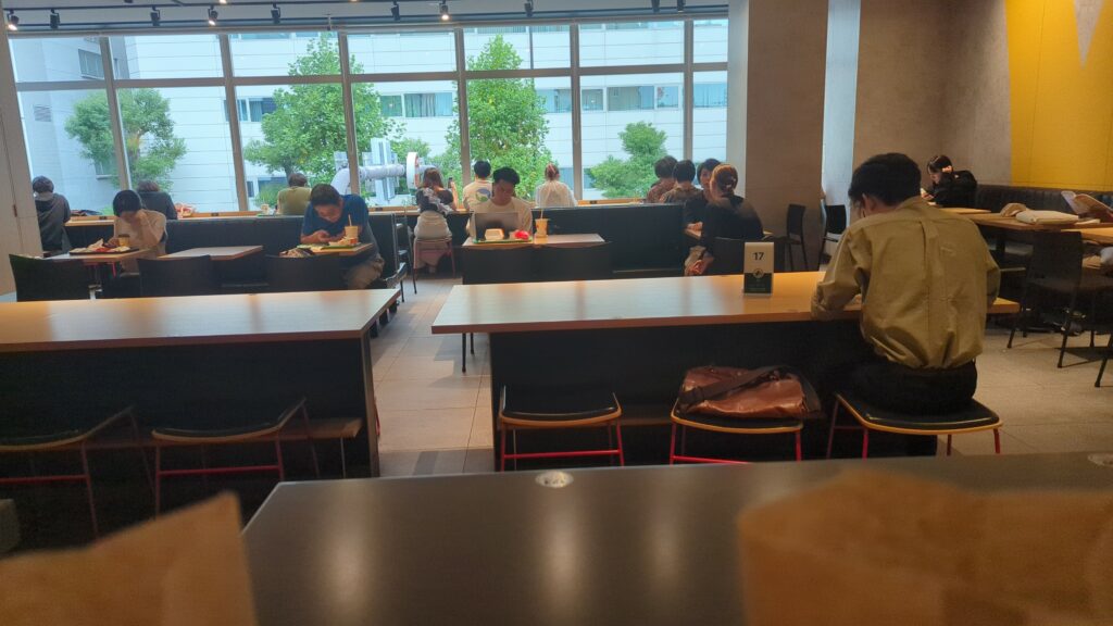 Nos damos cuenta de que los McDonald’s en Japón son muy diferentes a los de España. En los de España, estamos acostumbrados al sonido de la gente, y sobre todo, al de las cocinas. En los de Japón, nos encontramos el mismo silencio como si estuviéramos en el tren. Además, las mesas están preparadas para sentarte individualmente, y lo que vemos es que varios japoneses lo usan para trabajar. Creemos que ha valido la pena venir al McDonald’s para ver este choque cultural.