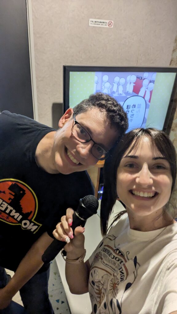 Terminamos nuestro día entrando en una sala de Karaoke privada para los dos. El repertorio de canciones está mayormente en japonés, pero hay algunas en inglés, así que hacemos un rato el paripé y cantamos como podemos.