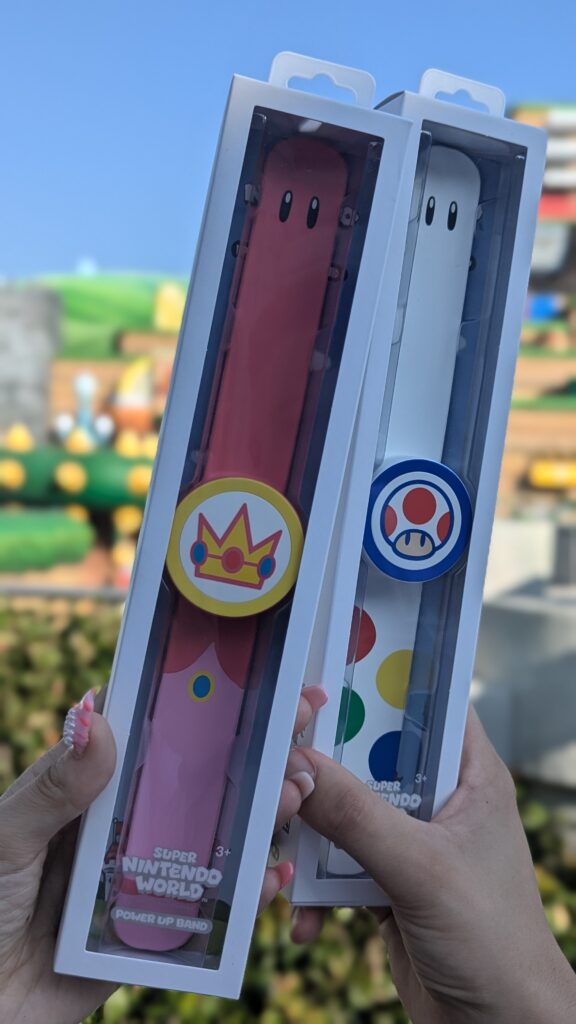 En la entrada hay un puesto donde venden la pulsera para poder interactuar con el escenario del parque en la que te dejan elegir entre Mario, Luigi, Peach, Daisy, Yoshi o Toad. La pulsera cuesta 3800 yenes (unos 32€) cada una. Es muy cara y opcional, pero desde nuestro punto de vista, es muy recomendable, ya que todo lo que te encuentras por el parque gira en torno a esta pulsera. También es importante el personaje que elijas, ya que será lo que definirá tu equipo dentro del parque. Nosotros elegimos las pulseras de Peach y Toad.