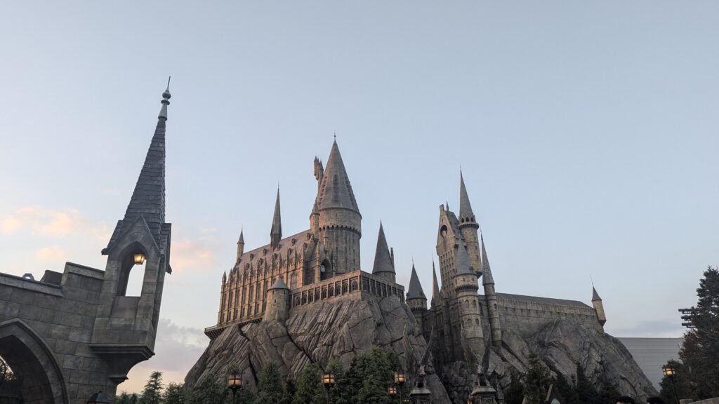 A las 17:30 se pone el sol, y después de un día estupendo, decidimos salir del parque de atracciones y volver a nuestro hotel a descansar, no sin antes volver a pasar por Hogwarts para echarle una foto anocheciendo.
