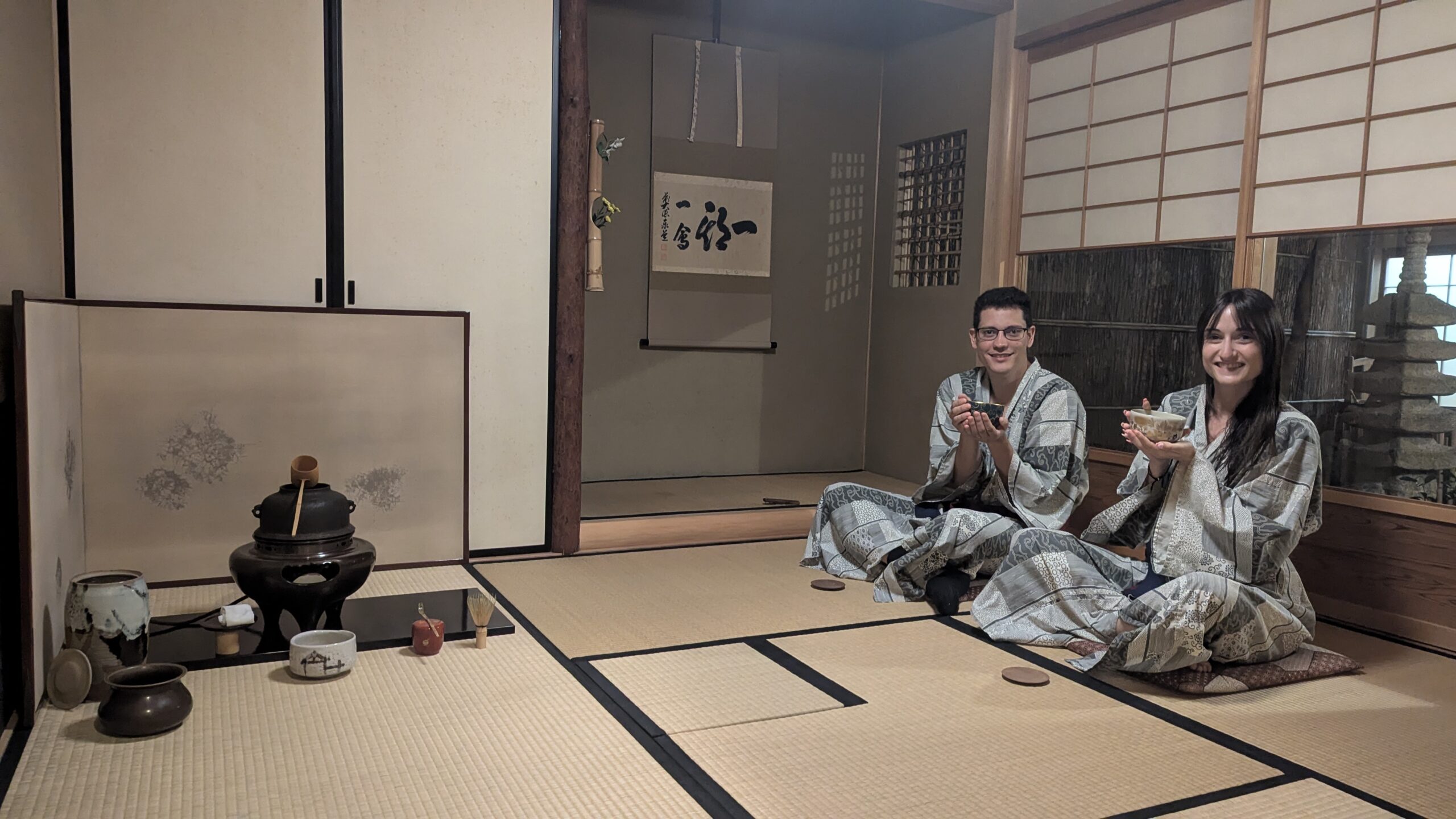 En este momento nos dan dos yukatas (una especie de kimono ligero que se usa en verano), y nos explican cómo nos los tenemos que poner. Nos acomodamos y pasamos un rato súper tranquilo tomando el matcha.
