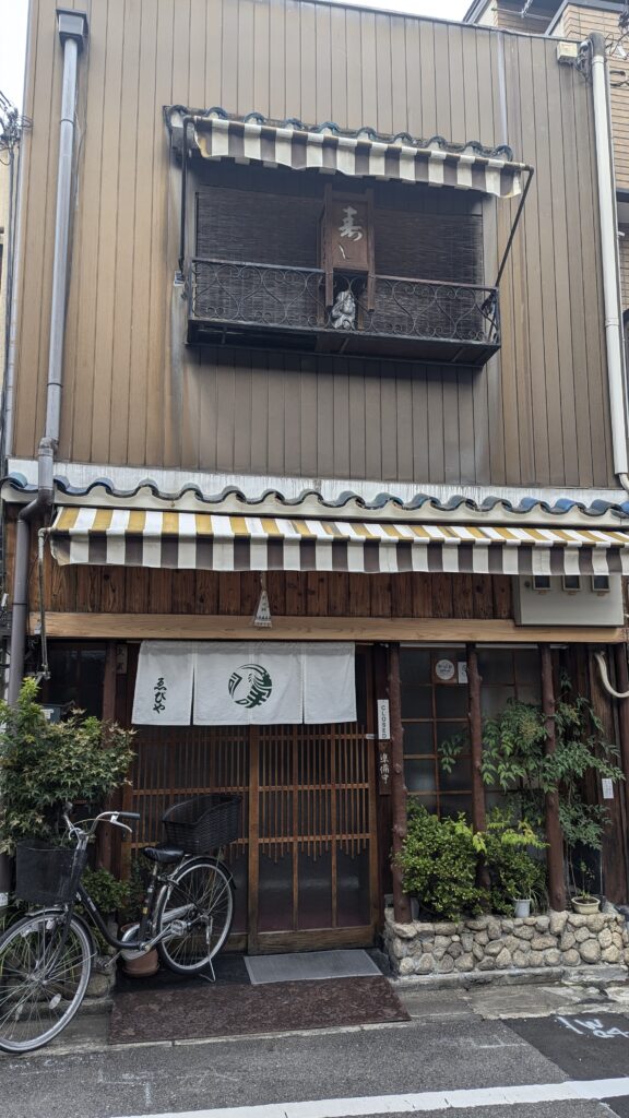Restaurante muy tradicional en una zona residencial (nada turística) de Kyoto. El dueño del local no habla inglés, pero se hace entender muy amablemente. Para seguir la dinámica, somos los únicos extranjeros del restaurante. Hay otras dos mesas con gente joven local, que mientras cenan, miran la tele del local participando en un concurso (que parece ser de preguntas) que están dando. Debe de ser algo como cuando nosotros vemos la Ruleta de la Suerte mientras comemos.