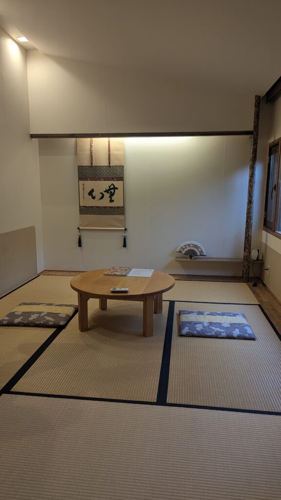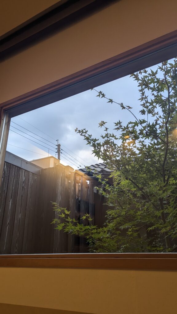 Al llegar, nos recibe muy amablemente un matrimonio, que nos permite entrar en su casa, pidiéndonos que nos quitemos los zapatos. La casa es muy tradicional y muy pequeñita. No debe de tener más de 4 habitaciones. Subiendo unas escaleras, llegamos a nuestra habitación, que a primera vista nos encanta. Se trata de una habitación muy sencillita con suelo de tatami y una ventana que da hacia un patio interior con un árbol. En el centro de la habitación hay una mesita con dos vasitos de matcha preparados.