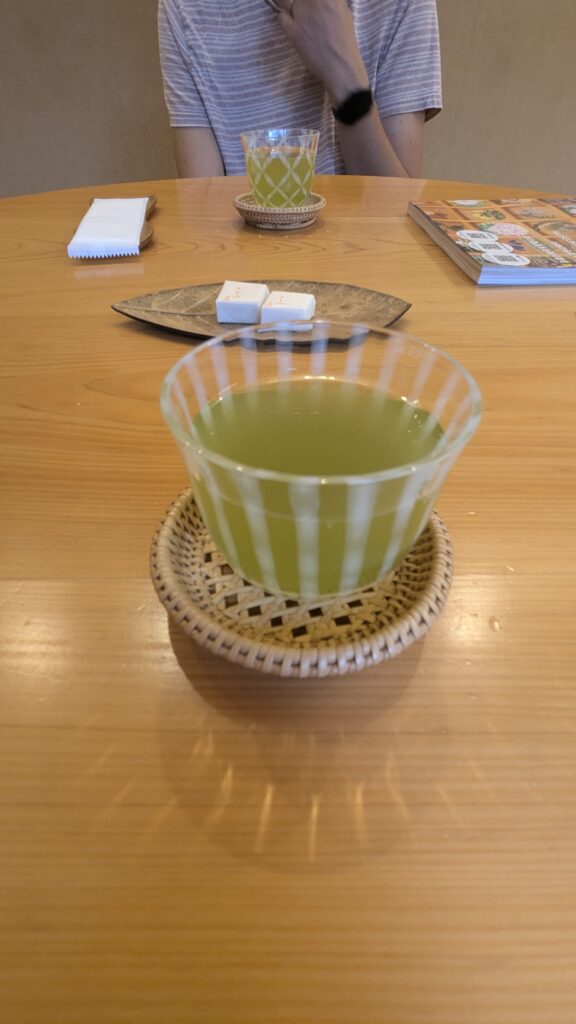 Después de volvernos a vestir, nos espera la mujer del ryokan, preparada para hacernos una ceremonia del te, un ritual que forma parte de la cultura japonesa que consiste en preparar siguiendo una especie de coreografía. Se busca promover valores como la harmonía, el respeto, la pureza y la tranquilidad creando una experiencia estética y espiritual entre el anfitrión y los huéspedes. Al ser algo tan espiritual, nos piden que no lo grabemos, y está totalmente justificado, ya que es un momento de relajación en el que conviene apartar los móviles.