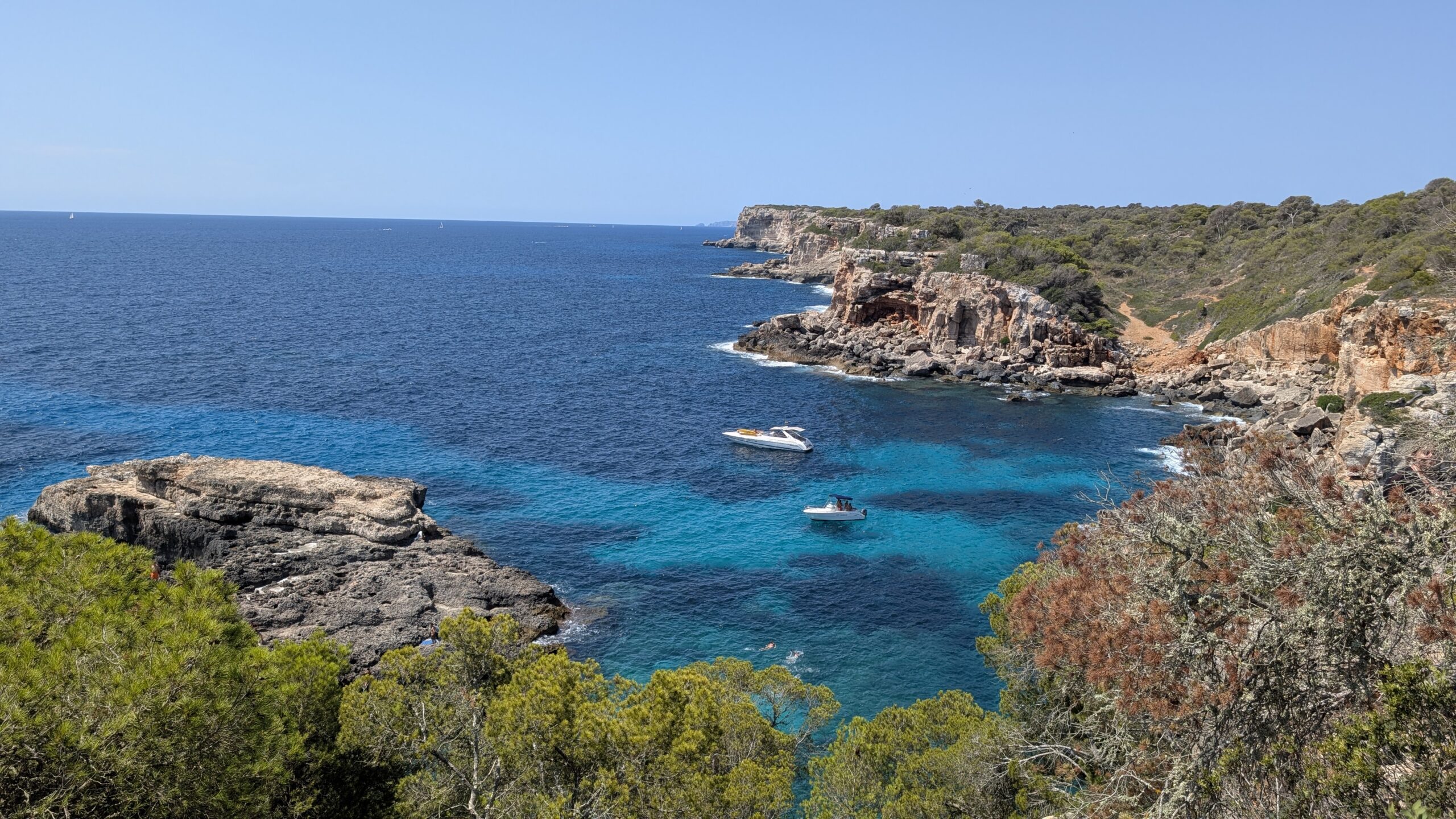 Después de volvernos a vestir como podemos en la playa, hacemos el caminito de vuelta hacia la Cala s’Almonia. En esta cala también hay mucha gente, pero hay muchas rocas donde poder ponerte y ya se puede estar más tranquilo. En esta cala, hay un pequeño grupo de casas antiguas de pescadores, y en lugar de arena, hay un muelle para las barcas que estos usaban. Aún así, es un lugar ideal para bañarse debido a sus aguas cristalinas, ideales para hacer un poco de snorkel.