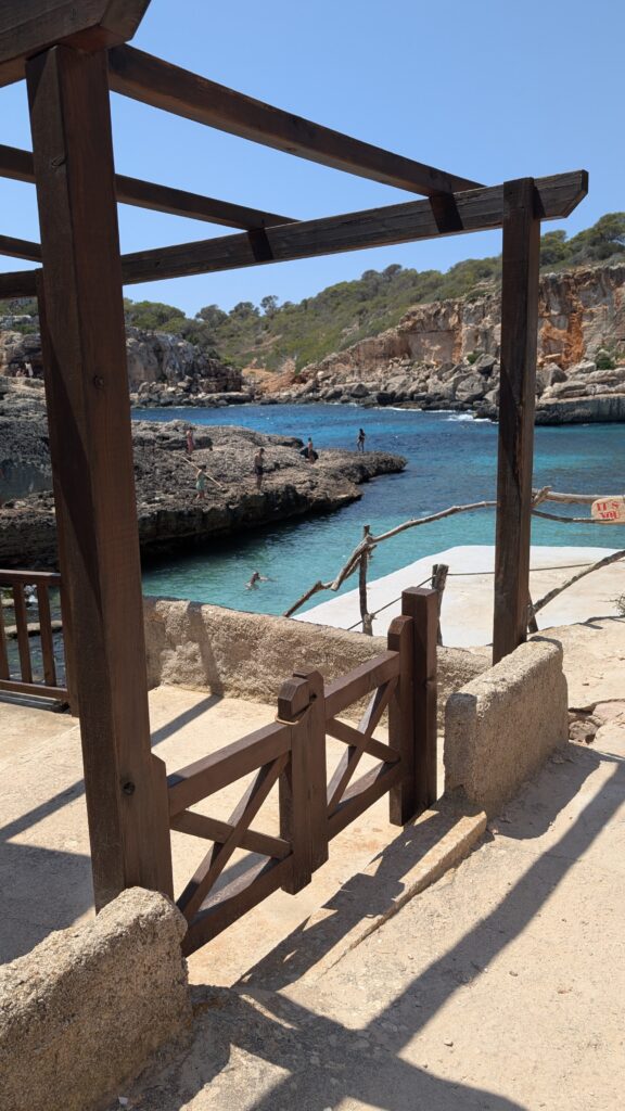 Cruzando la urbanización y llegando a la costa, hay unas escaleras muy, muy empinadas, que llevan a la Cala s’Almonia. Después nos quedaremos en esta cala, pero primero vamos a la atracción turística principal. Por un caminito, a pocos metros, se encuentra el Caló des Moro. Esta pequeña playa es muy bonita, tal y como se muestra en las fotos, con aguas turquesas y cristalinas, y arena blanca y fina.