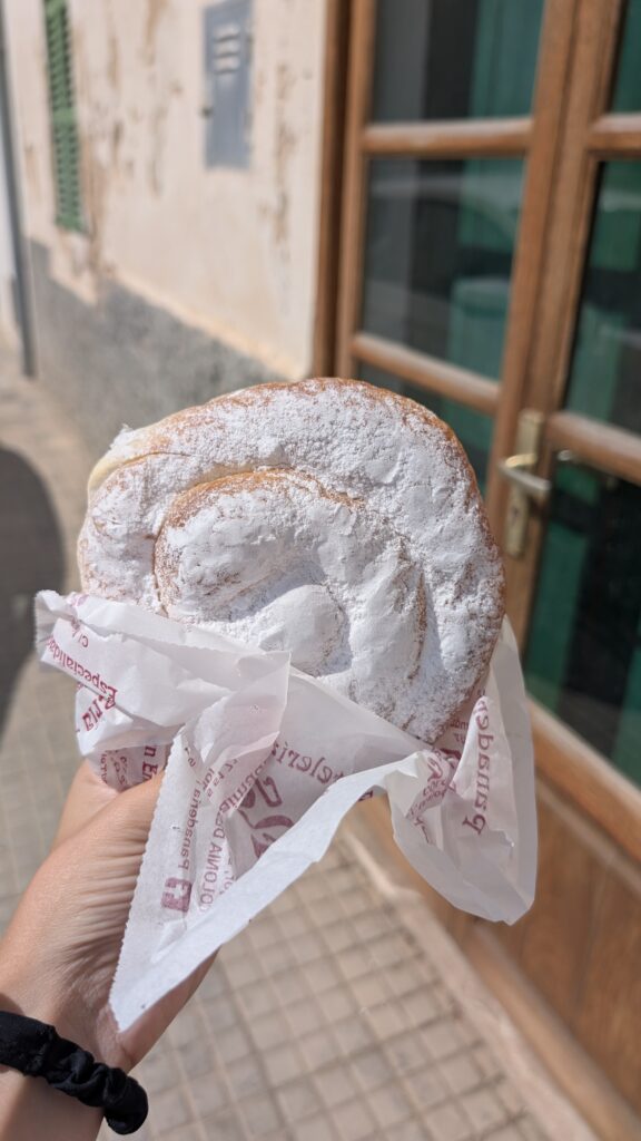 Como postre, consideramos comernos una ensaimada, ya que todavía no nos hemos comido ninguna en el tiempo que llevamos. Para ello, nos vamos a la Colònia de Sant Jordi, que está a unos 13km. Concretamente nos han recomendado el Forn de pa Pons. Allí, nos compramos dos ensaimadas pequeñas que están realmente buenas.