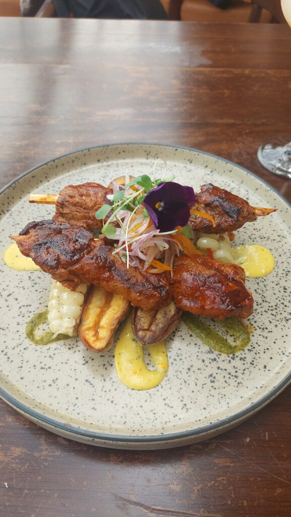 Aquí pedimos una causa de pulpo y unos anticuchos de alpaca, que aunque lleven el nombre de anticuchos, no són la parte del corazón, como suelen serlo. En este caso son el lomo de la alpaca. También, Lorena se quedó con el gusanillo de la hamburguesa de ayer, así que se pedirá una, a ver si hoy tiene más suerte. Para beber, una botella de agua y un maracuya sour.