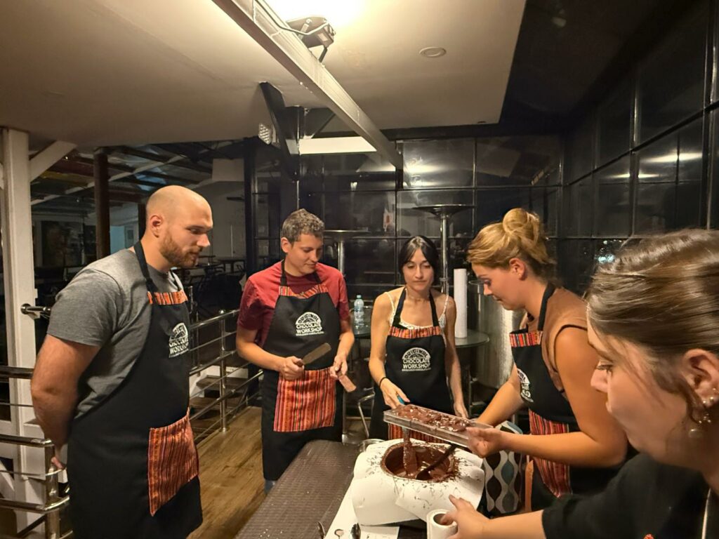 Durante el curso elaboramos unos bombones de chocolate, con un relleno de ganash hecho con miel y nata de la leche. También rellenamos a nuestro gusto con frutos secos y mermelada. La clase ha sido divertida y nos llevamos unos ricos bombones al hotel, aunque si tenemos que recomendar una clase, el taller de cocina del otro día nos gustó más.