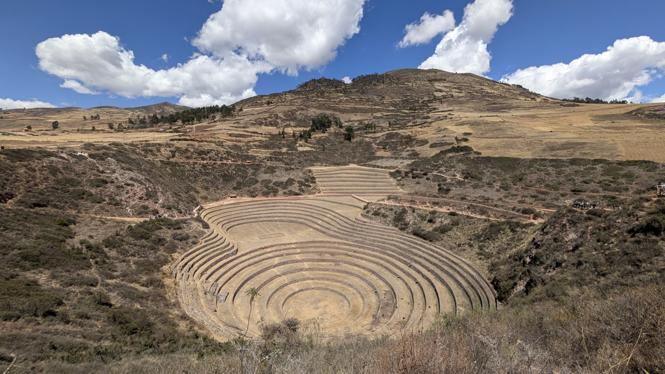 Después de ver Chinchero, nos compramos una empanada de espinacas que vendían en un puestecito, y seguimos nuestra ruta. La próxima parada es la zona arqueológica de Moray. Moray destaca por sus gradas agrícolas circulares, construidas en la cavidad de una montaña. Consiste en una gran obra de ingeniería, en la que conseguían crear microclimas en cada nivel, de modo que podían cultivar diferentes alimentos.