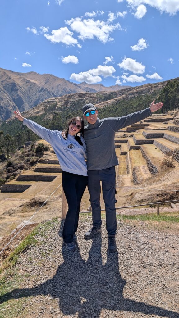 Estando en Chinchero, nos dan un pase para ver las cuatro zonas arqueológicas que visitaremos durante el día, y nos quedamos a ver la que hay en la misma ciudad. Los restos arqueológicos muestran un conjunto de gradas agrícolas donde cultivaban el maíz y varios barrios de viviendas. Se distingue la zona noble porque las piedras de las pareces están perfectamente talladas y encajadas.
