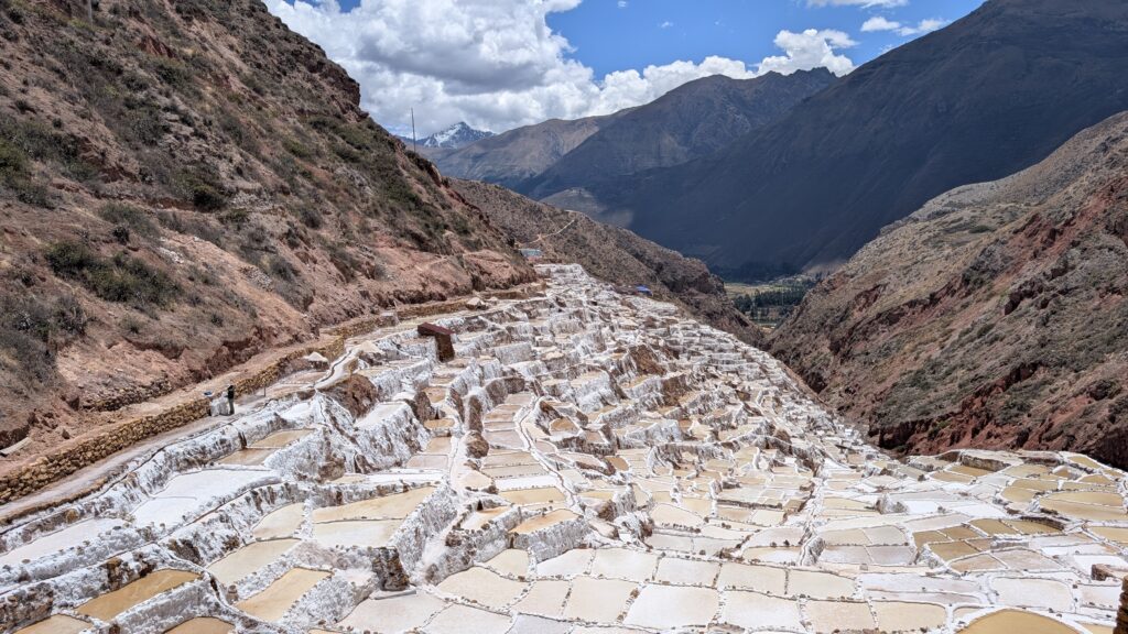 Visto Moray, vamos hacia las espectaculares Salineras de Maras, un conjunto de más de 3000 balsas, alimentadas por el río de agua salada que desciende de la montaña, y que producen kilos y kilos de sal, diariamente. De aquí se obtiene la famosa sal de Maras. La visita no permite entrar en la zona donde están las balsas, pero hay un mirador para observarlas.