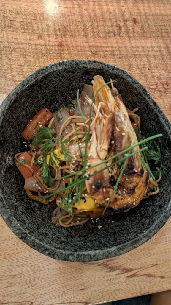 Es un restaurante fino. Solamente entrar, nos ofrecen una copa de cava. Subimos al piso de arriba y pedimos para cenar. Cenamos guacamole del huerto con crackers, que es un guacamole muy rico mezclado con varias verduritas, causa especial de la Morena, que resulta ser una buenísima causa con langostinos rebozados, ají y piel de pescado frita, y un mar y tierra, plato de fideos estilo Nikkei con gambón y ternera. Para beber, dos cócteles chicha morada sour.