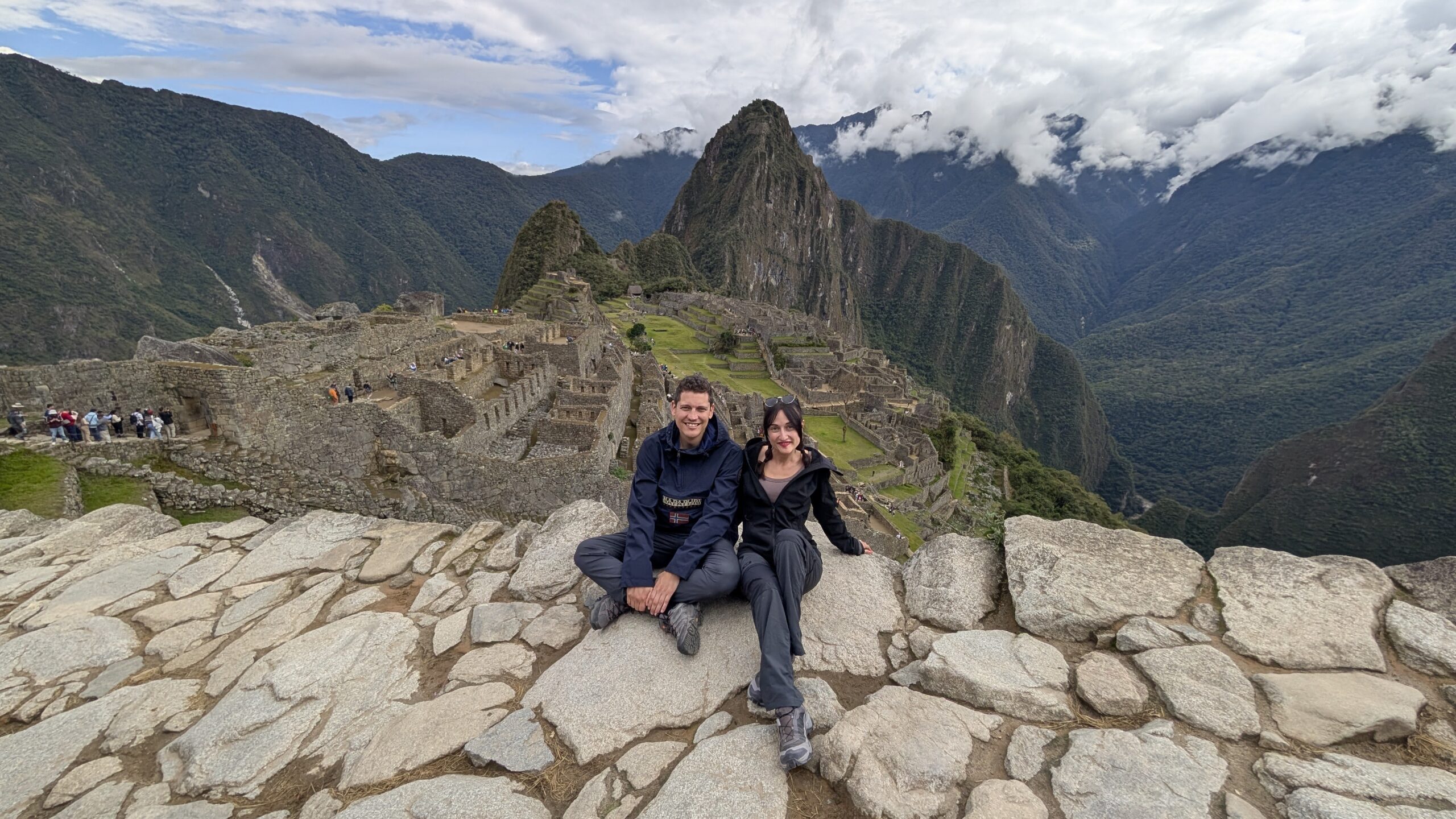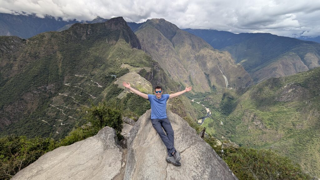 Después de un buen rato subiendo y sacando el hígado por la boca, ya que vamos bastante rápidos porque estamos algo justos de tiempo, llegamos a los andenes de la cima del Huayna Picchu. Allí, al no haber árboles sí que hay un poco más de exposición, y también hay algún escalón que no está bien fijado y se mueve al pisarlo. Da un poquito de miedo si se tiene vértigo, pero no demasiado. Al llegar arriba hay un mirador con vistas preciosas al Machu Picchu.