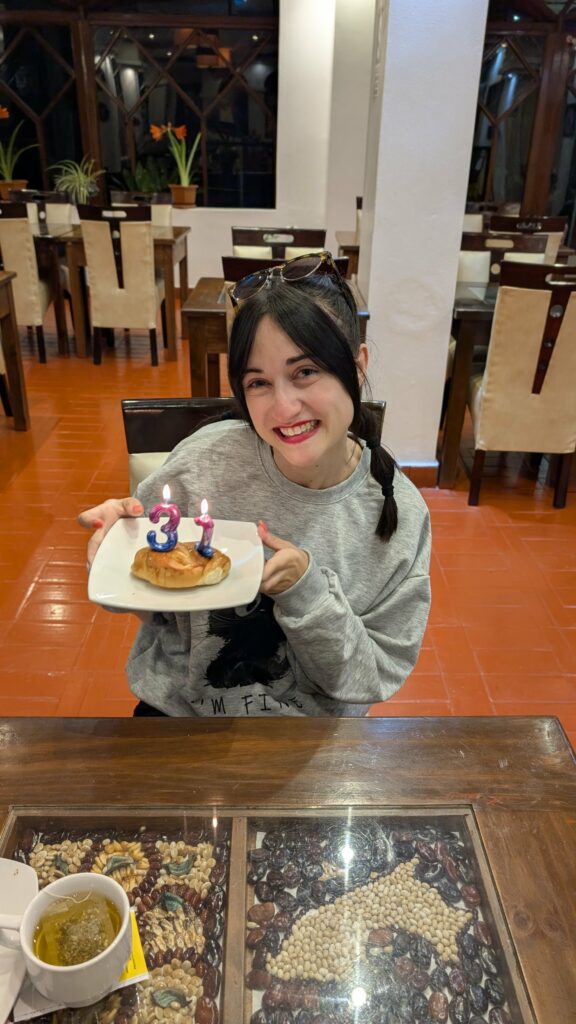 A las 5:00 abre el buffet del hotel, así que bajamos a comer algo rápidamente antes de irnos a hacer cola para el autobús. Aprovecho el despiste de Lorena para ponerle unas velas con el número 31 en un panecillo del desayuno. Le pido un mechero a la chica del hotel, y automáticamente pone la canción de «cumpleaños feliz» por los altavoces. No es que Lorena pase mucha vergüenza, porque estábamos prácticamente solos en el hotel, pero ha sido gracioso.