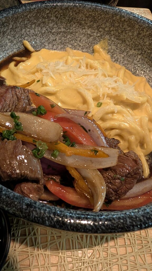 Hoy queríamos probar un restaurante de comida Nikkei, y hemos encontrado este, que tiene buena nota, en el centro de Cusco. Los platos son grandes. Nos hubiese gustado pedir más variedad, pero nos tenemos que conformar con seleccionar dos de ellos.