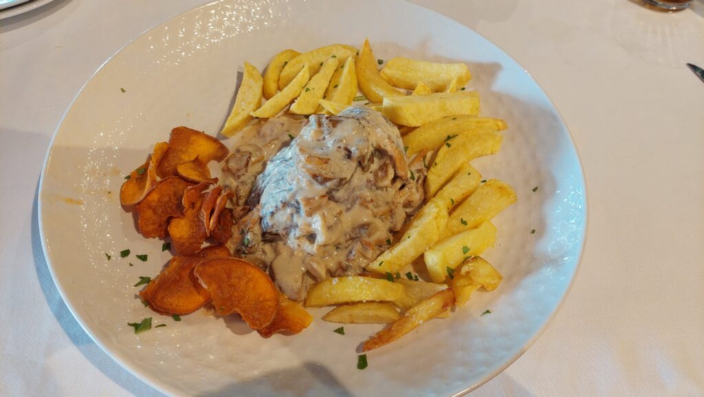 Como entrante nos pedimos un plato de escudella cada uno, que está bien, pero tampoco es la mejor que hemos probado. Y como segundo, unas costillas de cordero, y un filete con salsa de setas. Aquí, lo mismo, la carne está buena pero tampoco impresiona.