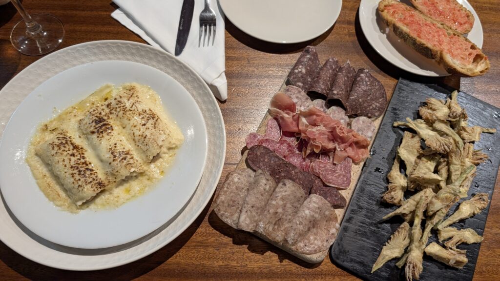 Pedimos varios entrantes para compartir: alcachofas rebozadas, una tabla de embutidos, y unos canelones de carne. La verdad es que está todo muy bueno, sobre todo los canelones.